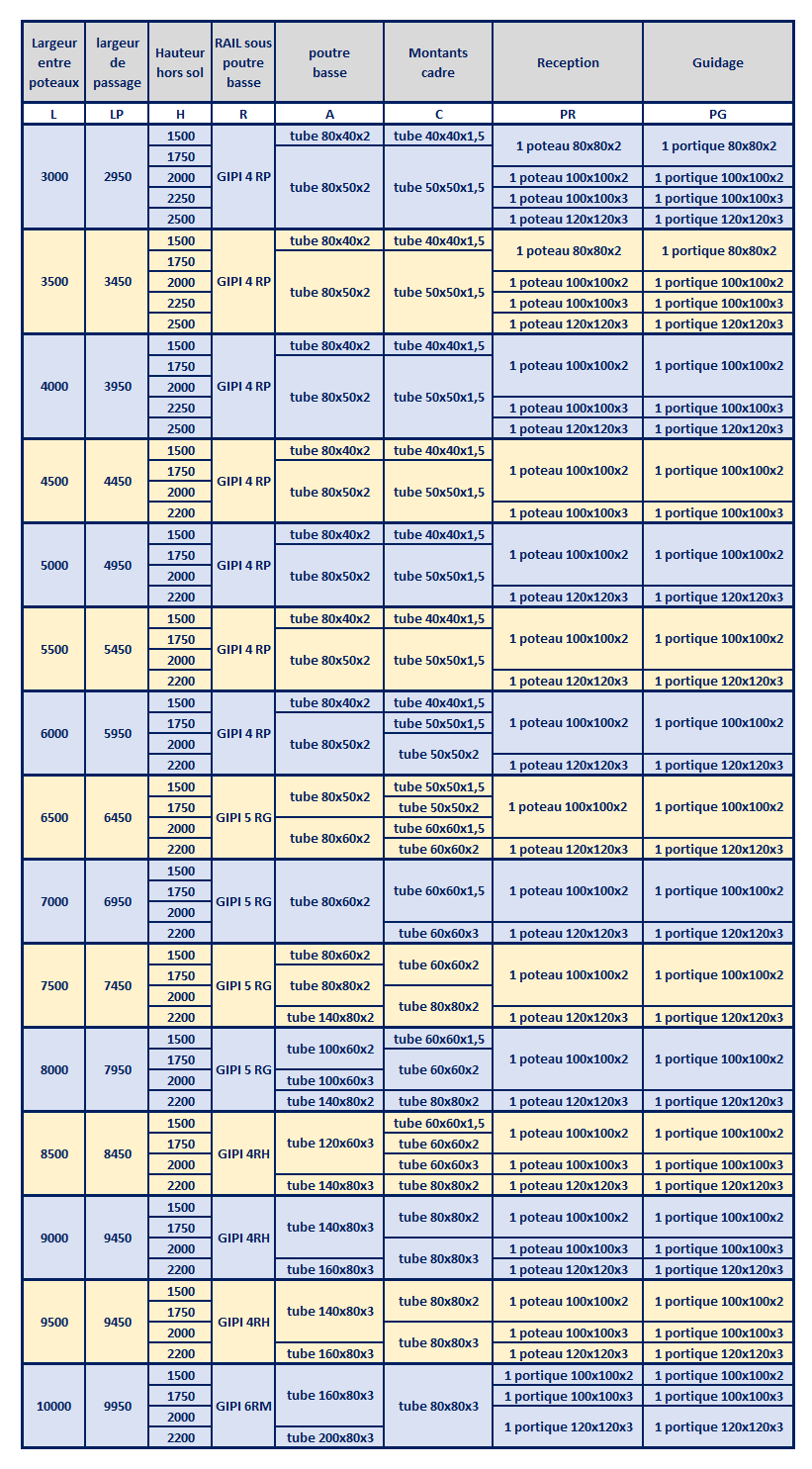 Tableau des spécifications techniques pour Autoportant Motorisable - SERIE C