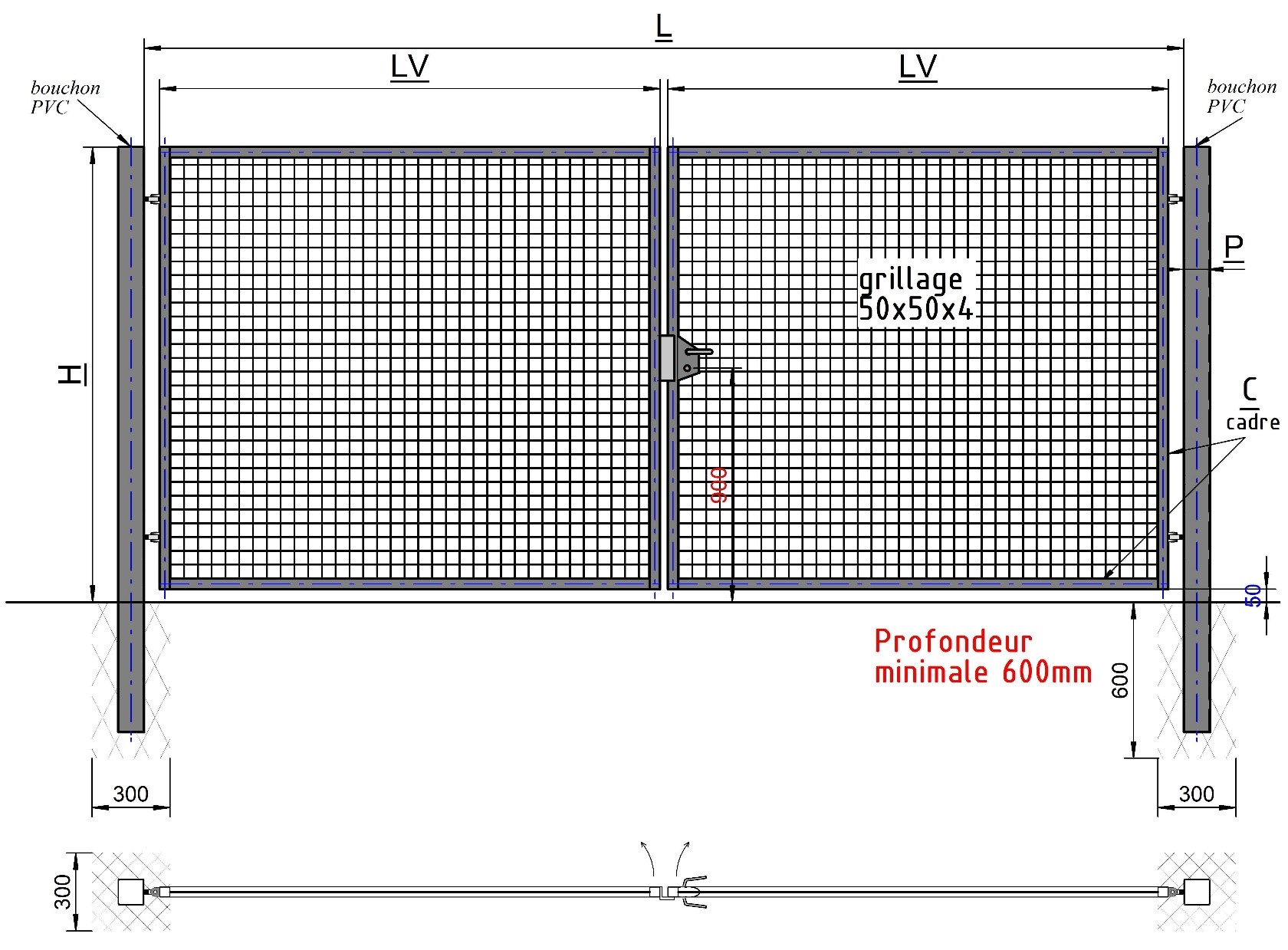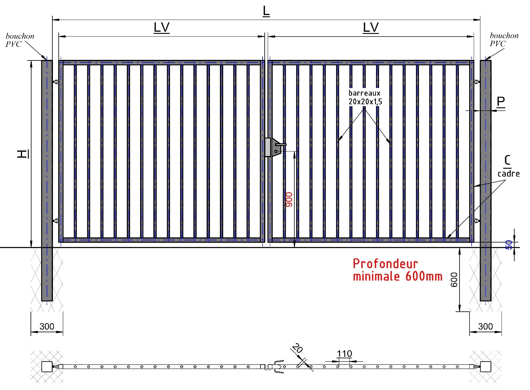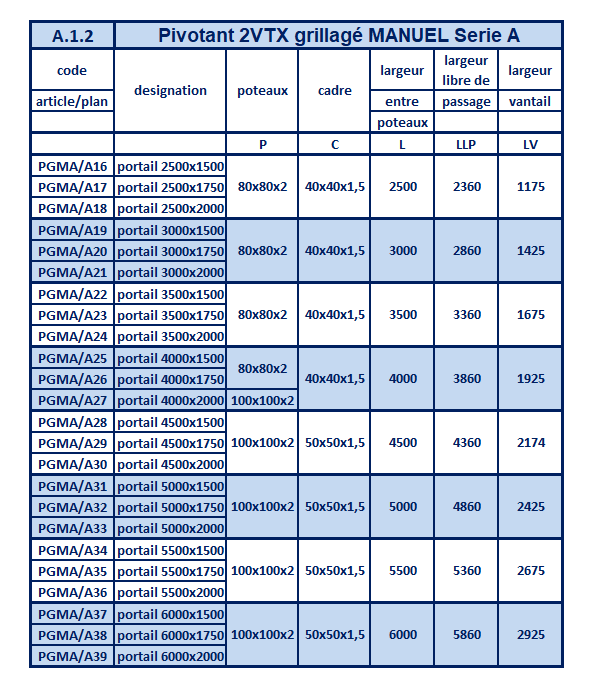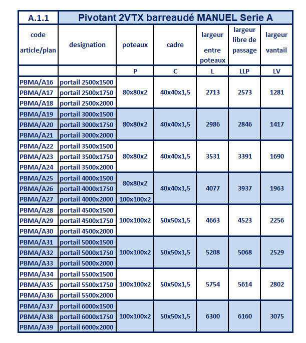 Tableau des spécifications techniques pour portail 2 vantail manuel - SÉRIE A