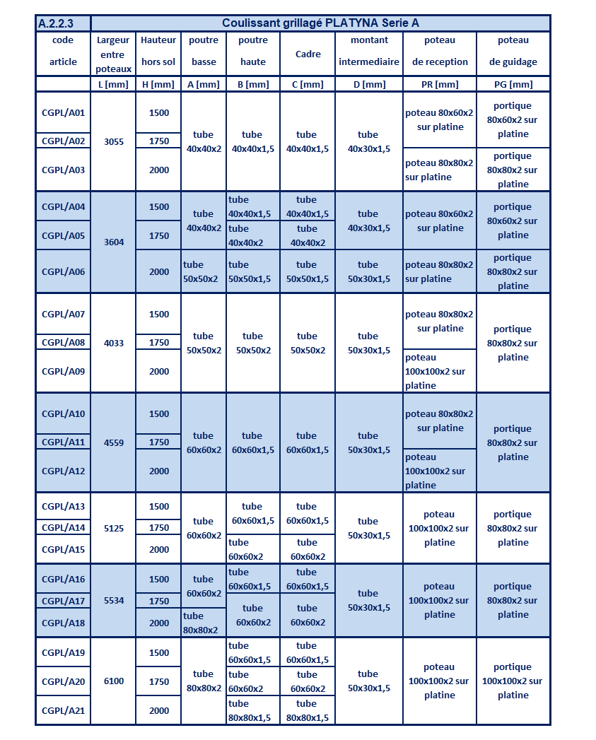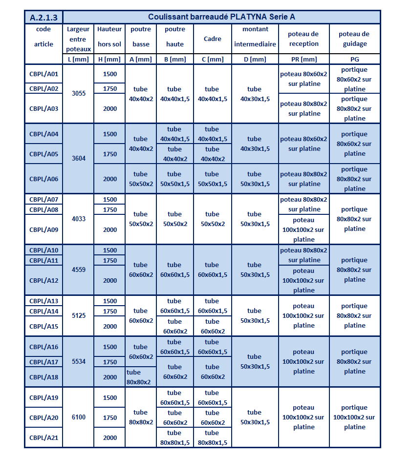 Tableau des spécifications techniques pour Coulissant PLATYNA - SERIE A