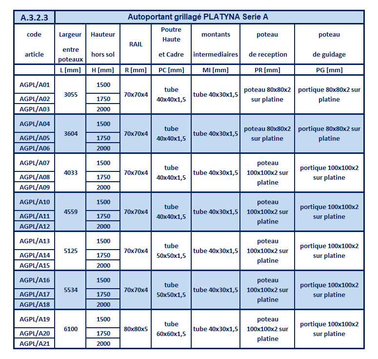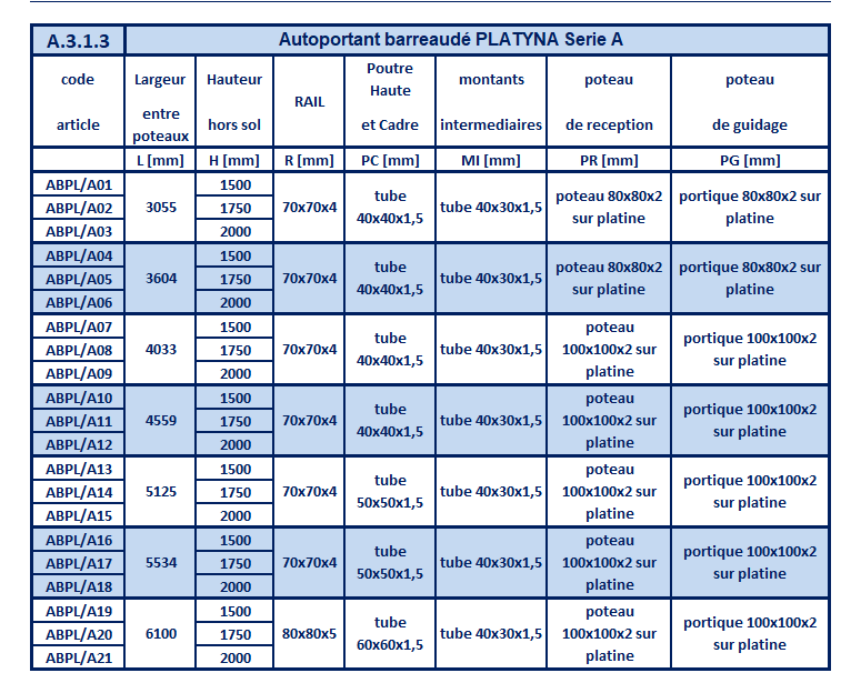 Tableau des spécifications techniques pour Autoportant PLATYNA - SERIE A