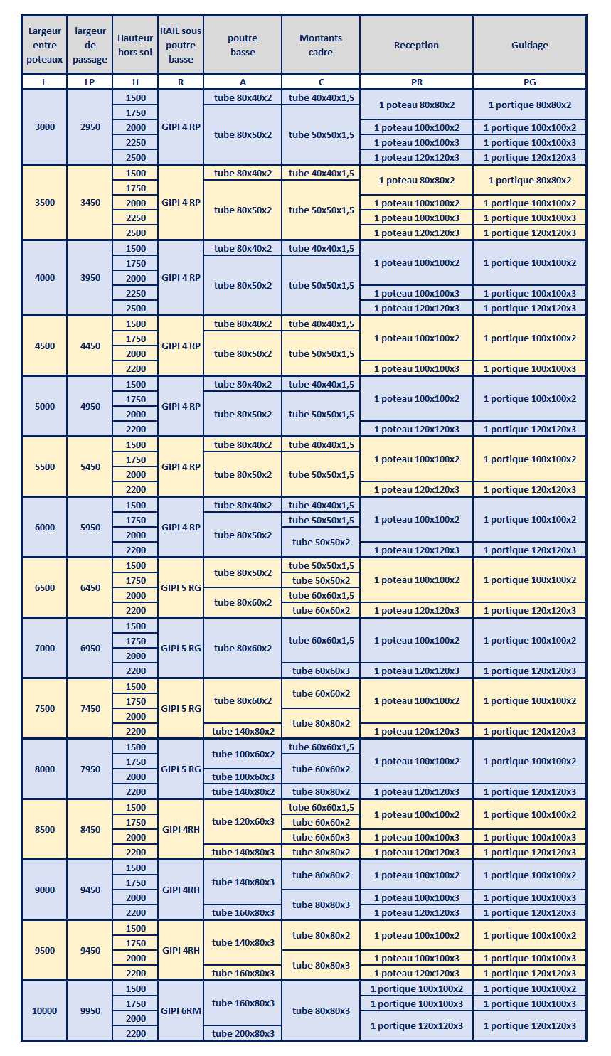 Tableau des spécifications techniques pour Autoportant Platyna - SERIE C