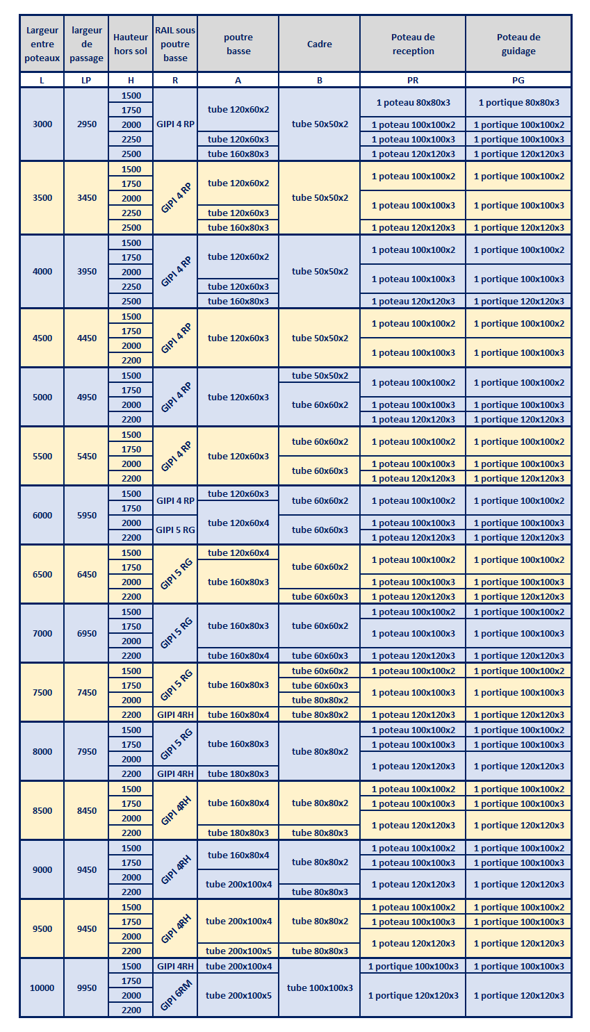 Tableau des spécifications techniques pour Autoportant Platyna - SERIE D